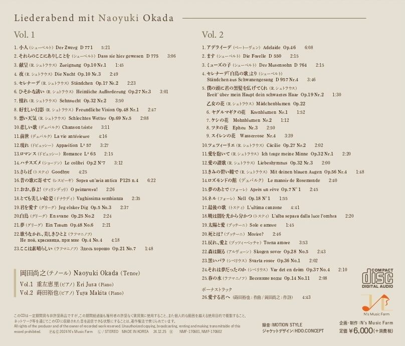 国際的に活動するテノール 岡田尚之 が 信頼する2人のピアニスト 重左恵里 蒔田裕也 と共に織りなす ドイツ・フランス・イタリア・北欧・ロシアの珠玉の歌曲集